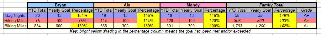One thing we have been doing, though, is to set some specific goals for biking and hiking and ‘bag nights’ – nights spent in sleeping bags – for each year. This means that these goals are specific numbers to work toward rather than a soft idea (camp and ride more).